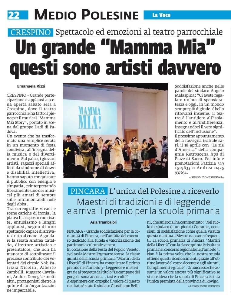 Grazie a La Voce di Rovigo per l’articolo dedicato allo spettacolo “Mamma Mia Story” della nostra Compagnia DADI, andato in scena il 28 marzo al Teatro Parrocchiale di Crespino!