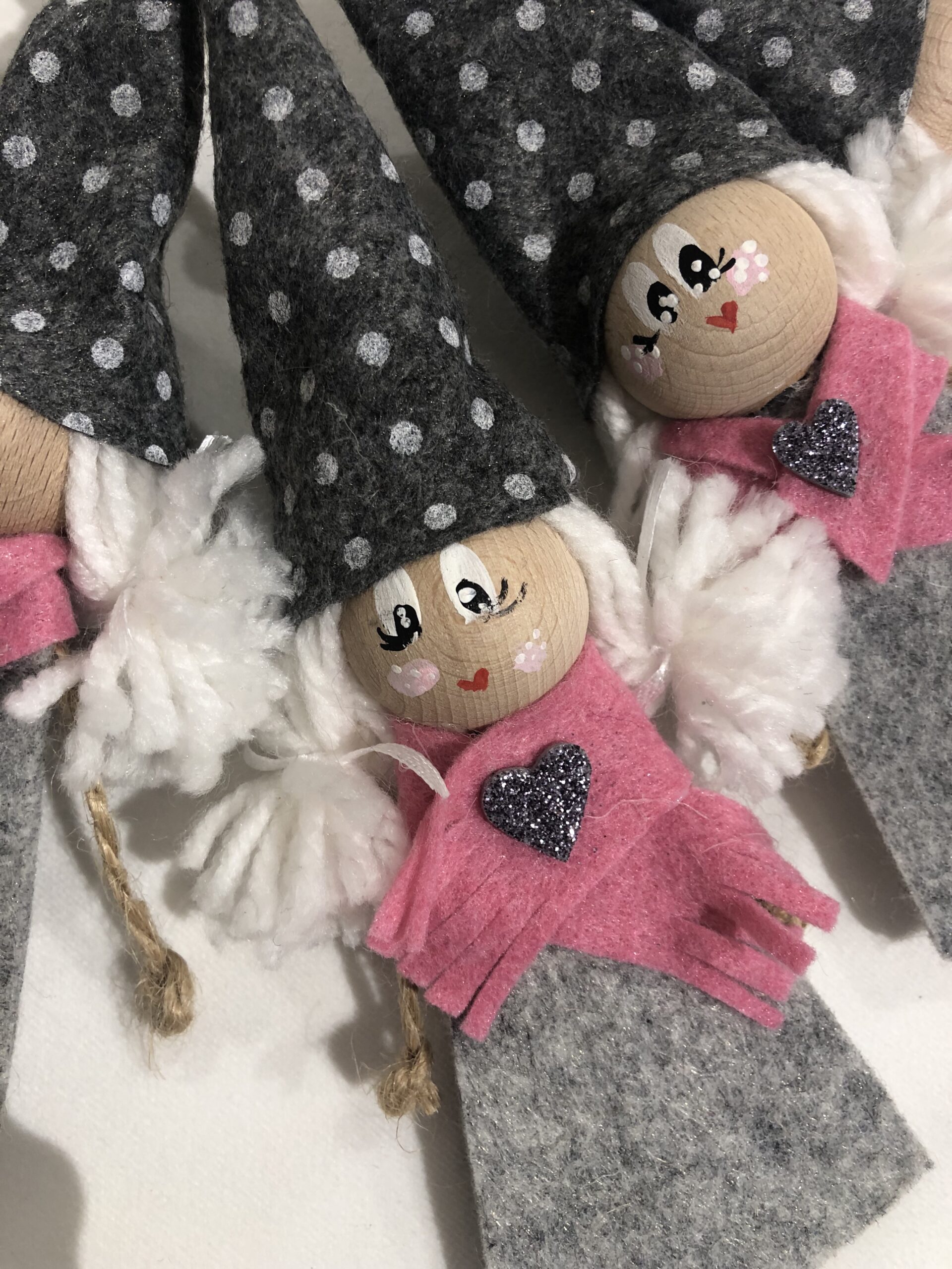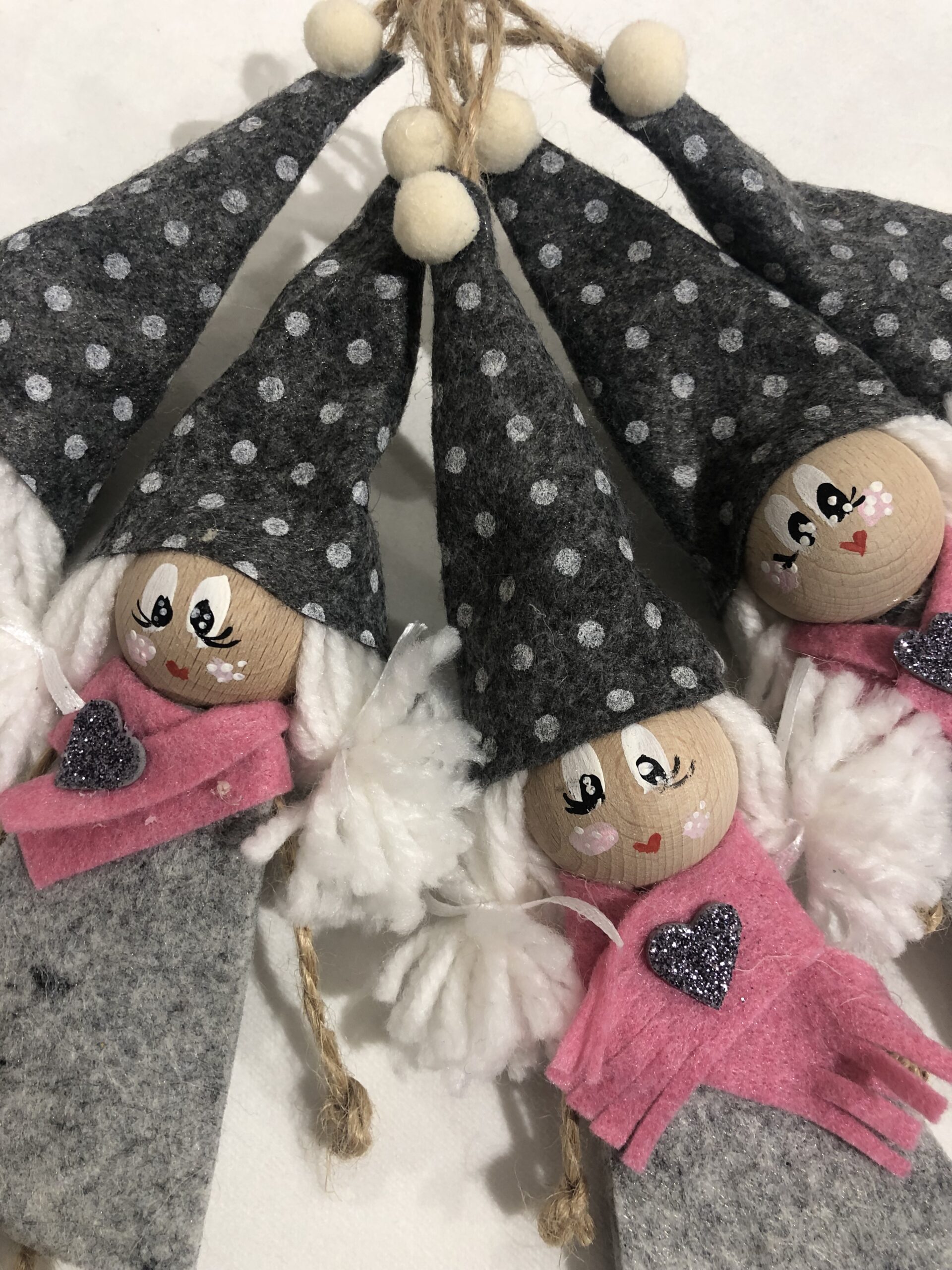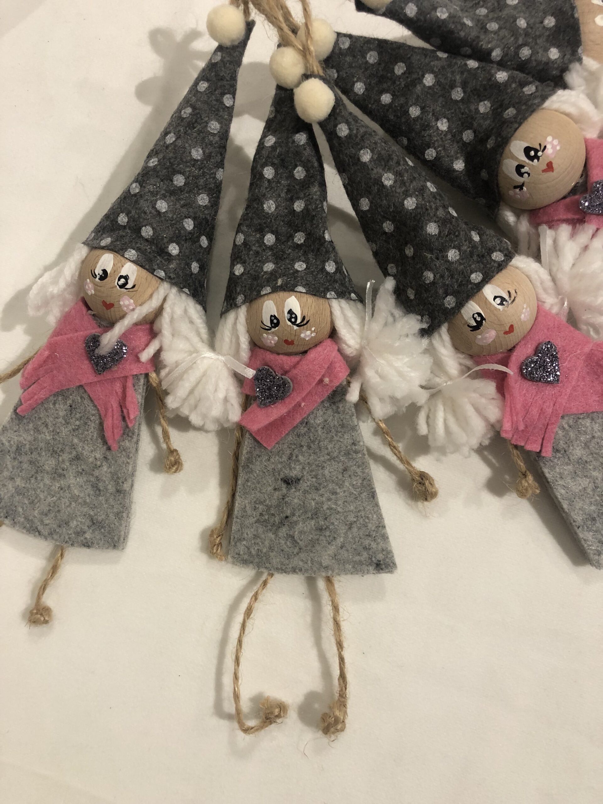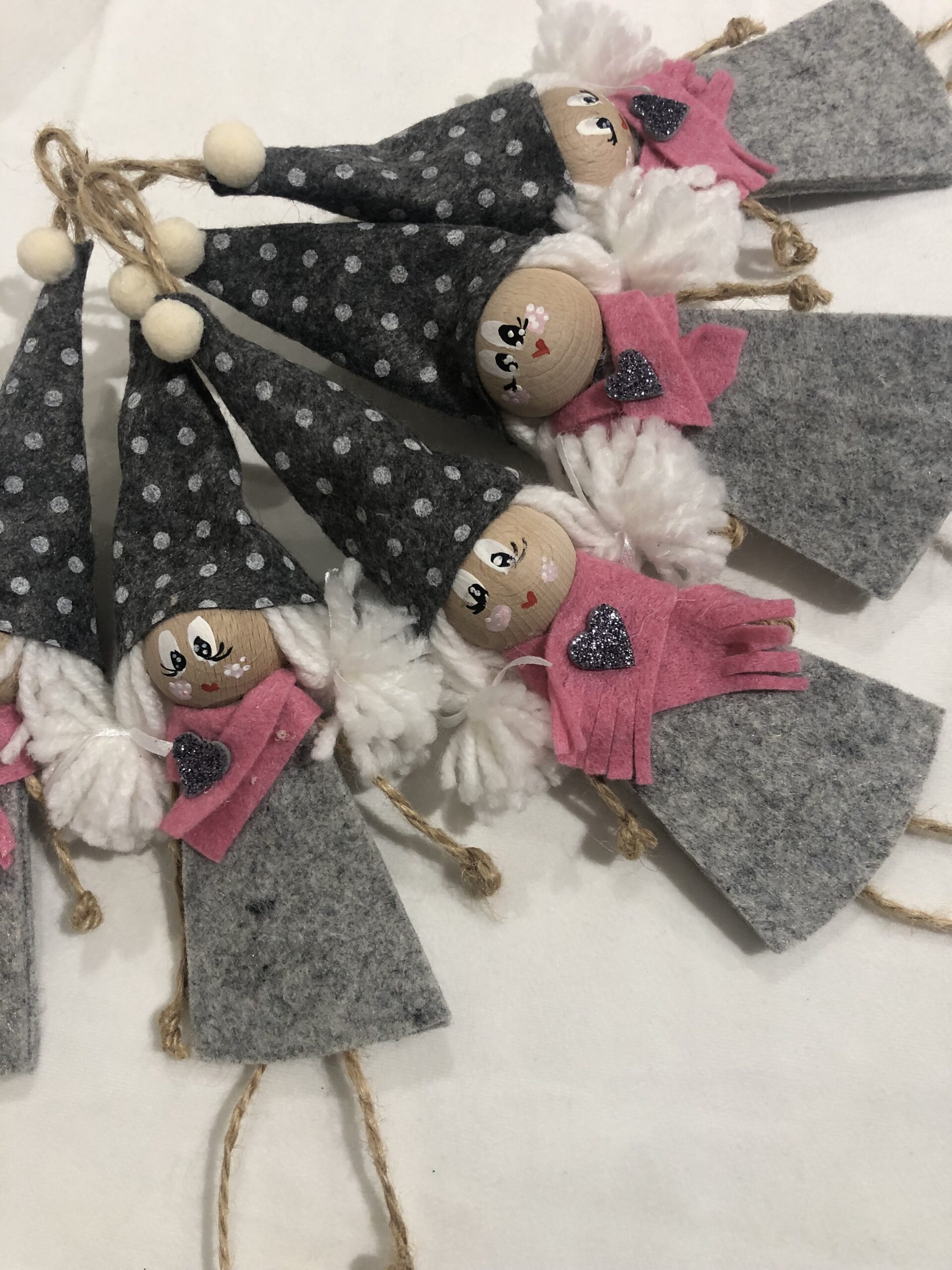 bamboline in feltro, con testa in legno dipinta a mano. decorazione con corda per appenderla all’all’albero. grandezza cm 23 I nostri decori annunciano un natale di…cuore! Sono simpaticissimi con questi dettagli in vari materiali, come farseli scappare?! sono di buon auspicio!