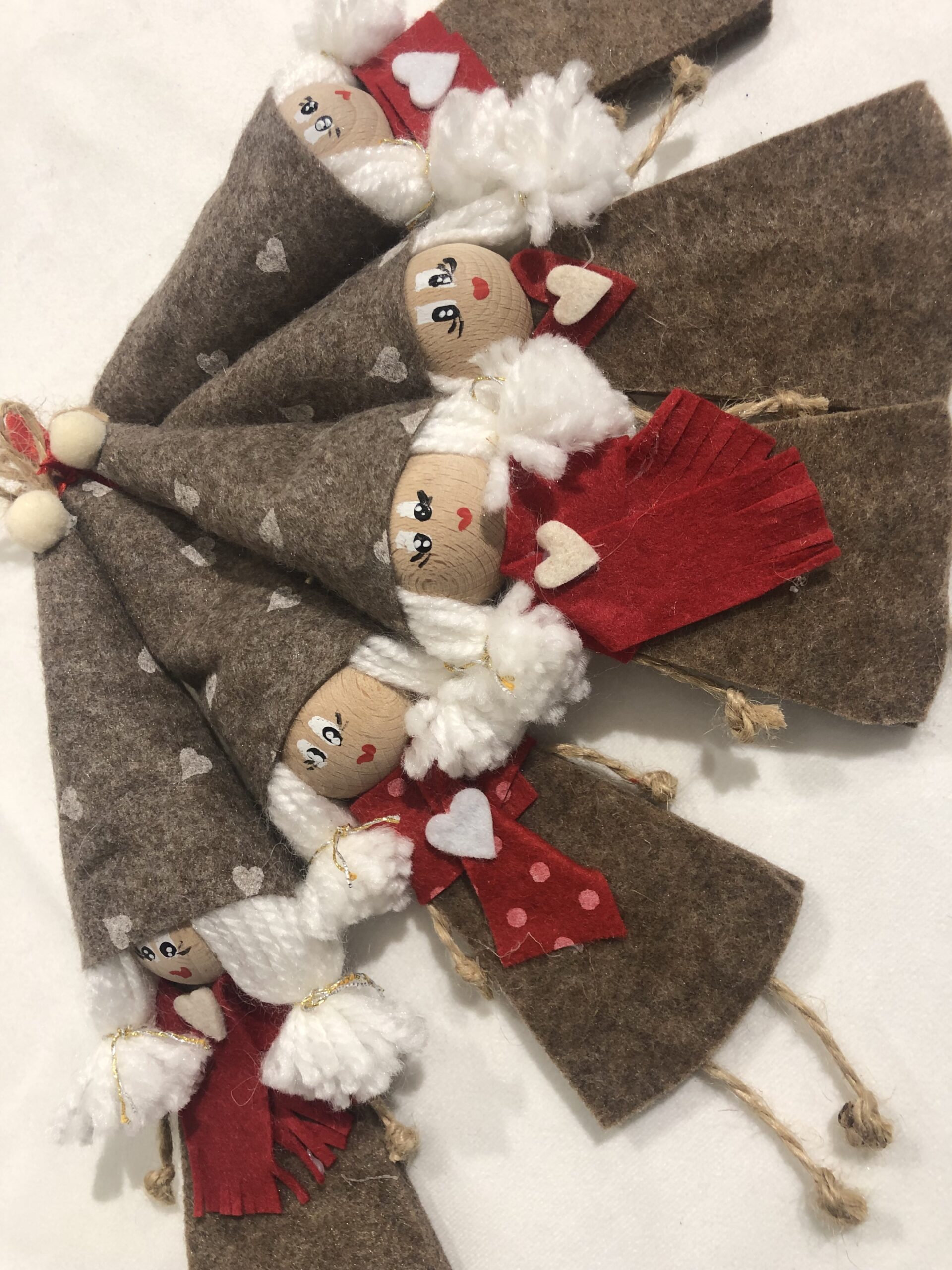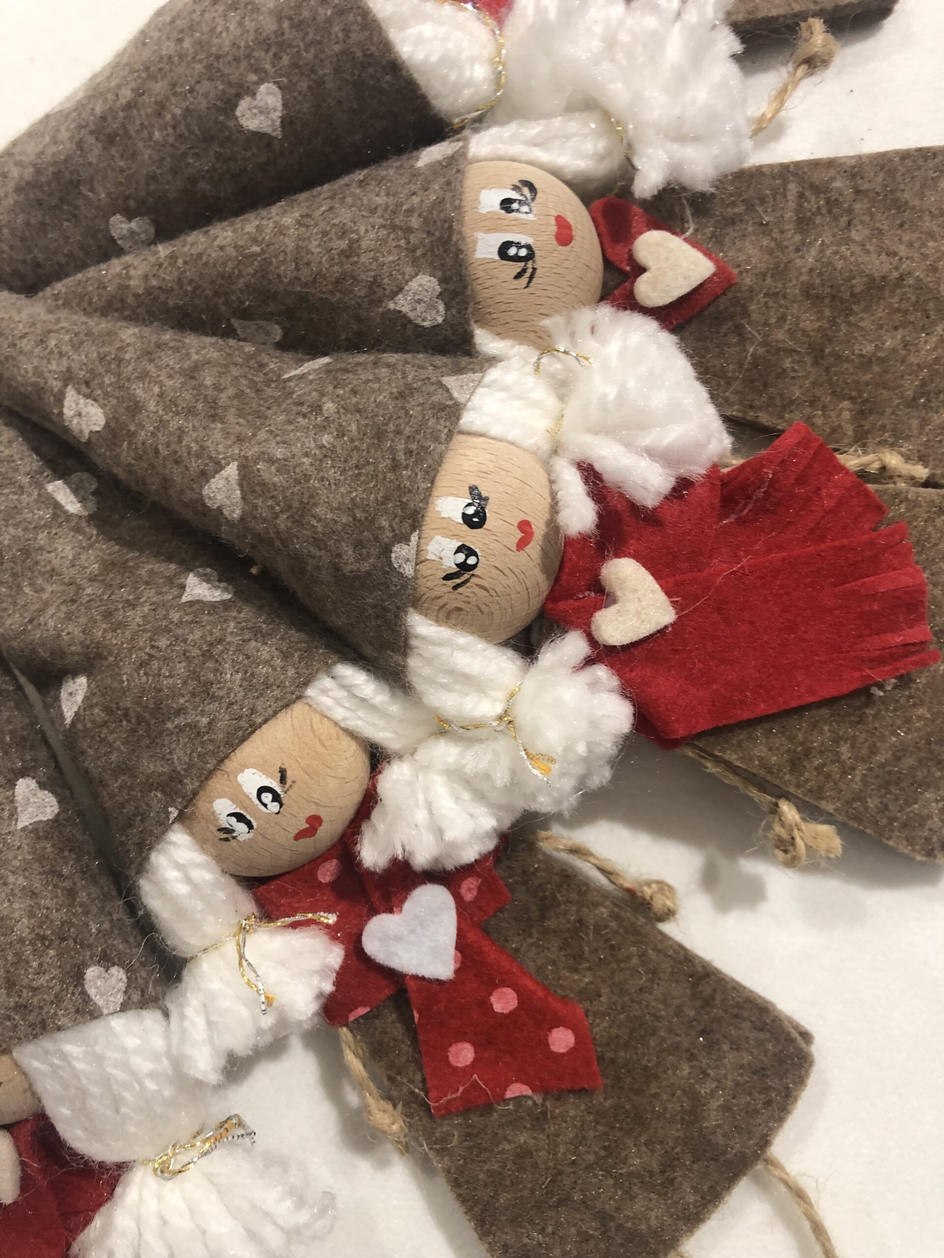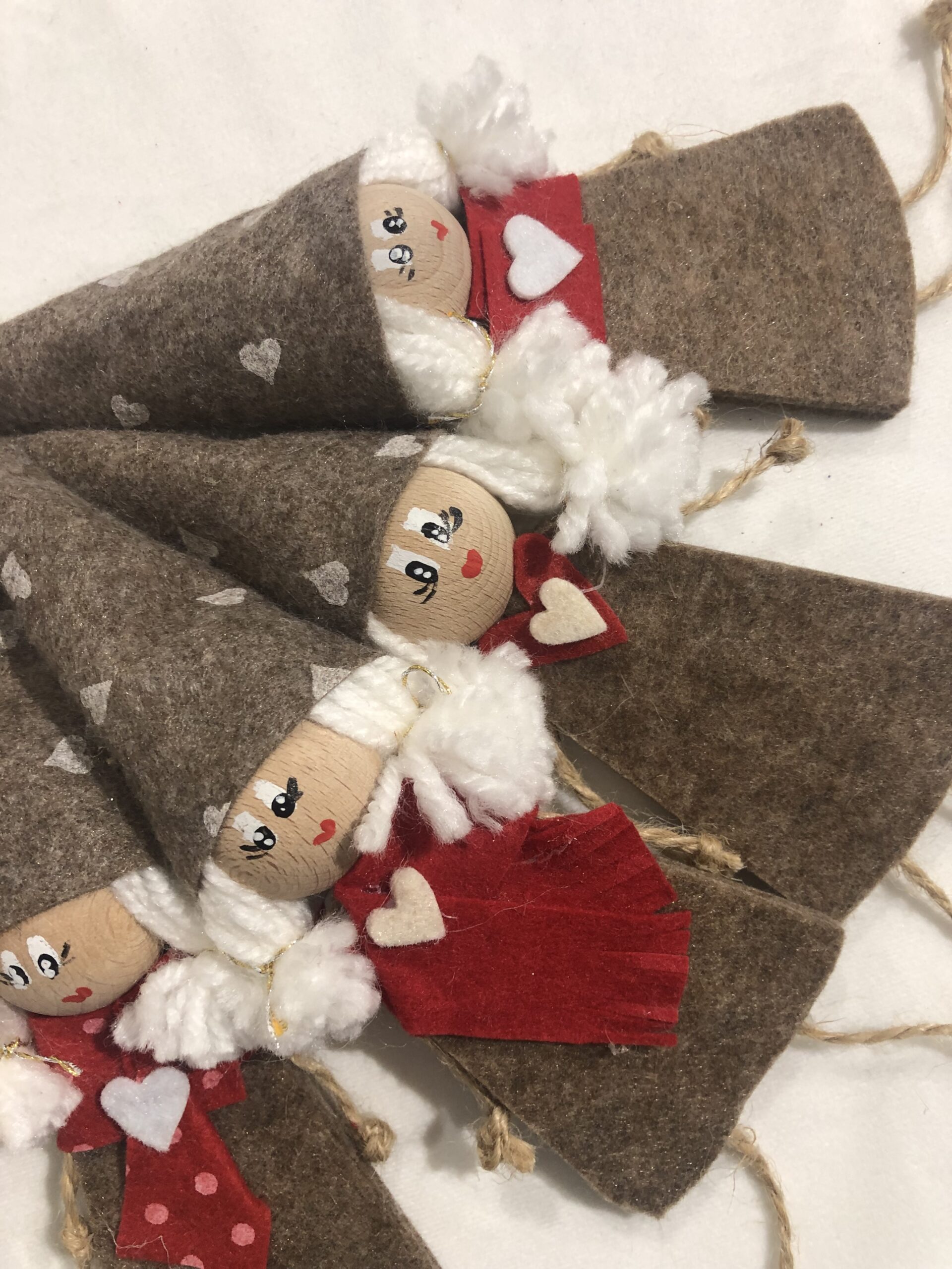 bamboline in feltro, con testa in legno dipinta a mano. decorazione con corda per appenderla all’all’albero. grandezza cm 23 I nostri decori annunciano un natale di…cuore! Sono simpaticissimi con questi dettagli in vari materiali, come farseli scappare?! sono di buon auspicio!