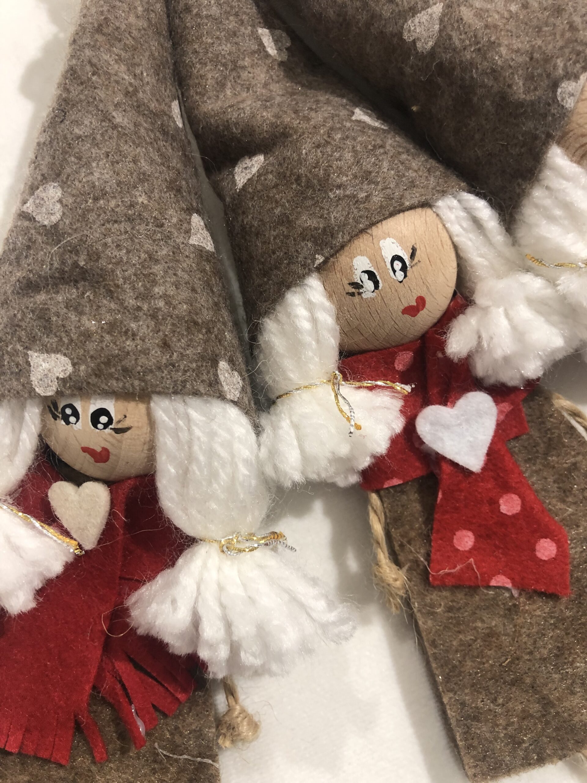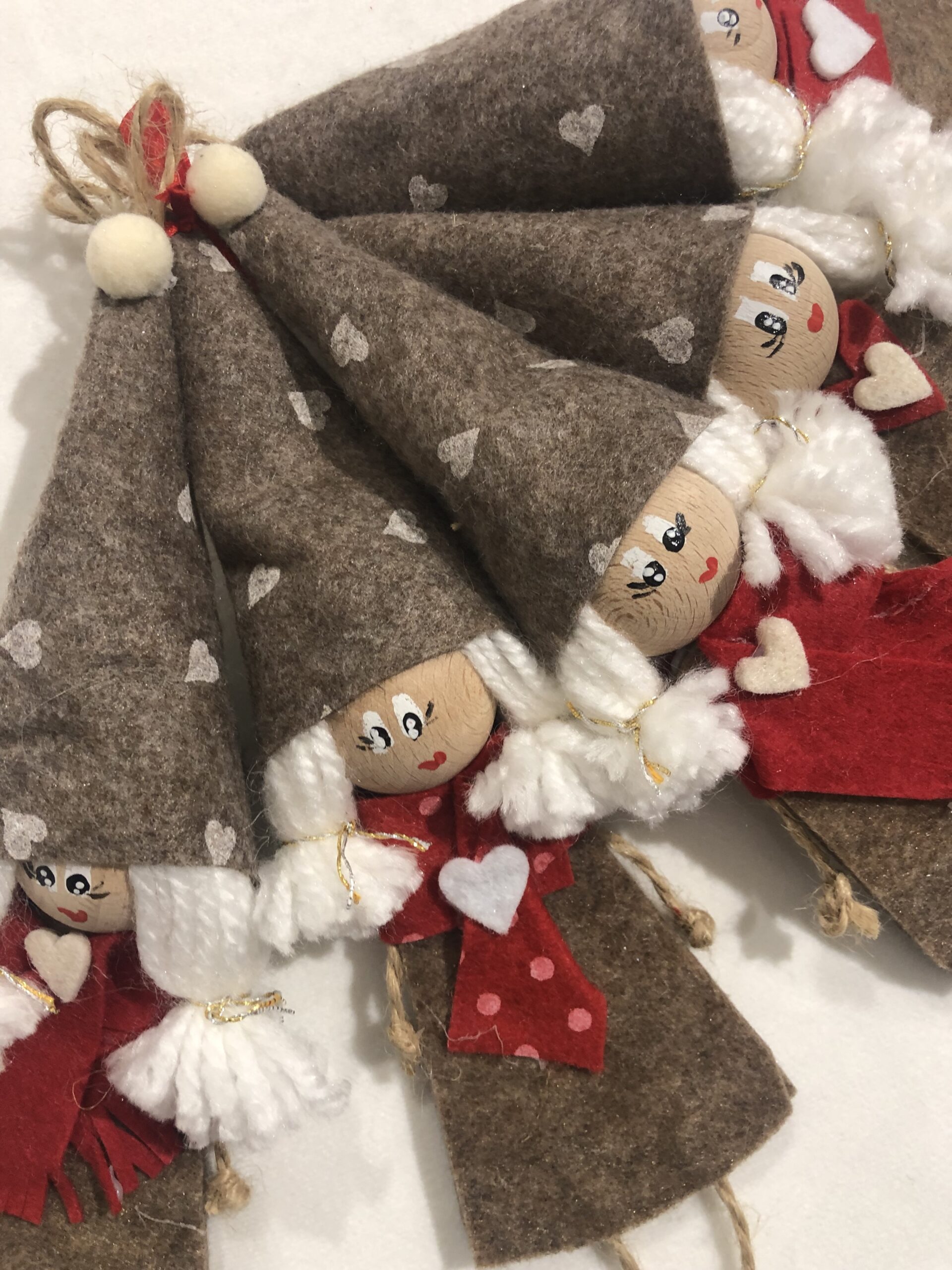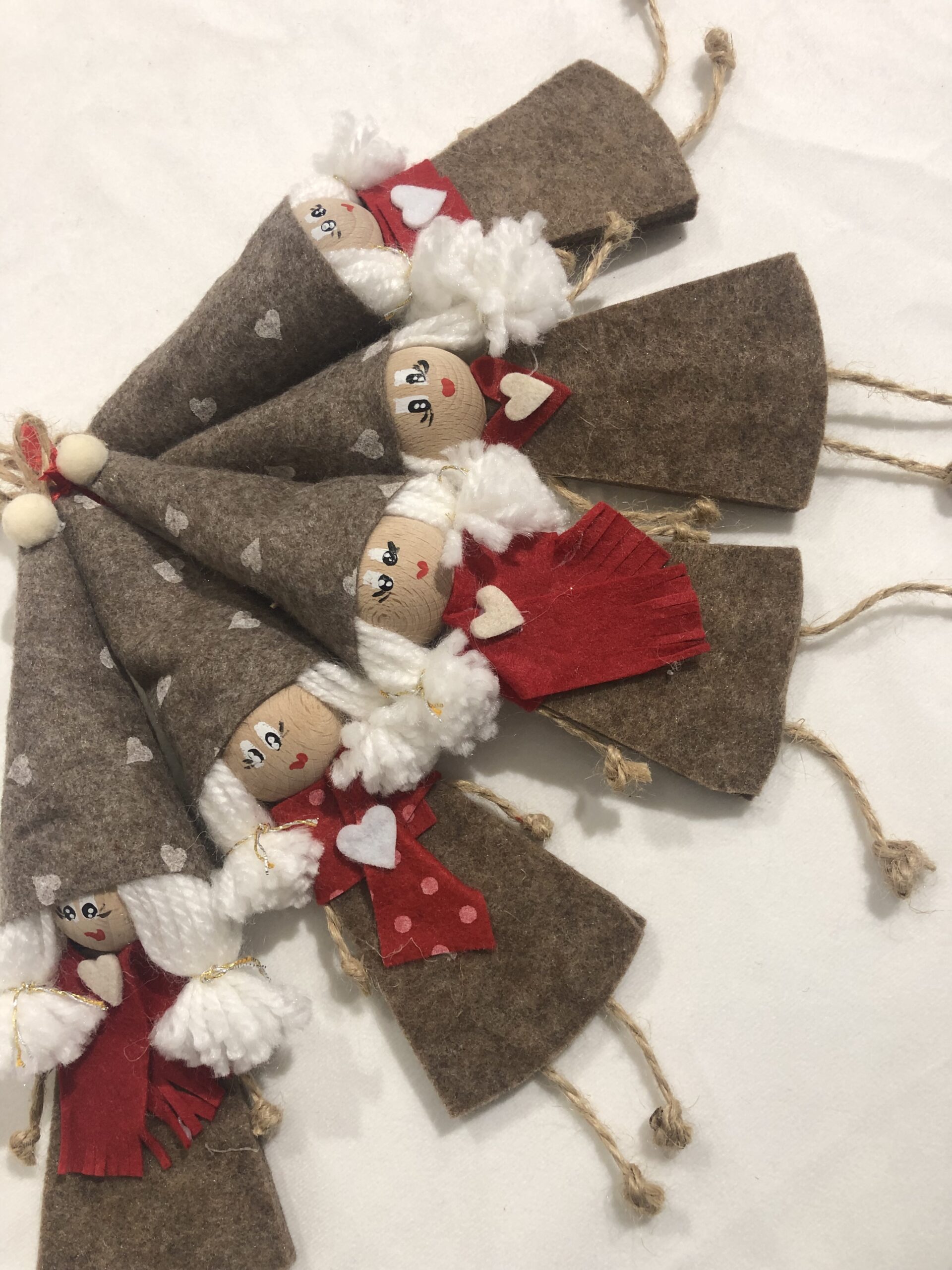 bamboline in feltro, con testa in legno dipinta a mano. decorazione con corda per appenderla all’all’albero. grandezza cm 23 I nostri decori annunciano un natale di…cuore! Sono simpaticissimi con questi dettagli in vari materiali, come farseli scappare?! sono di buon auspicio!