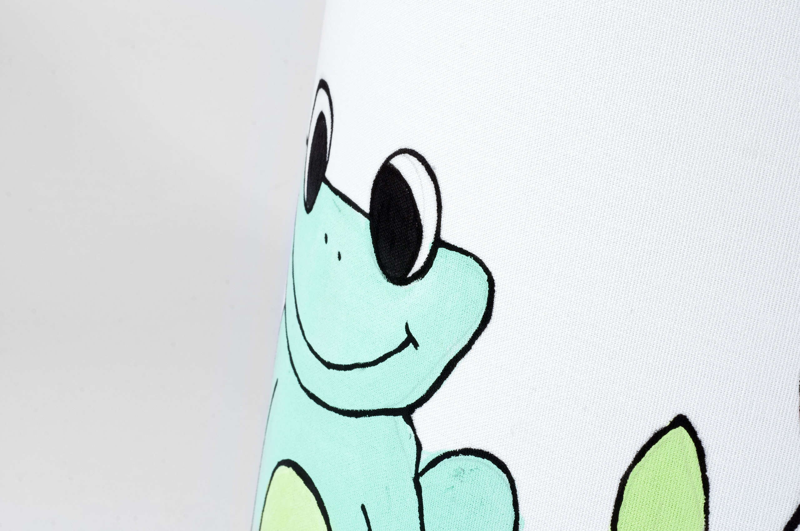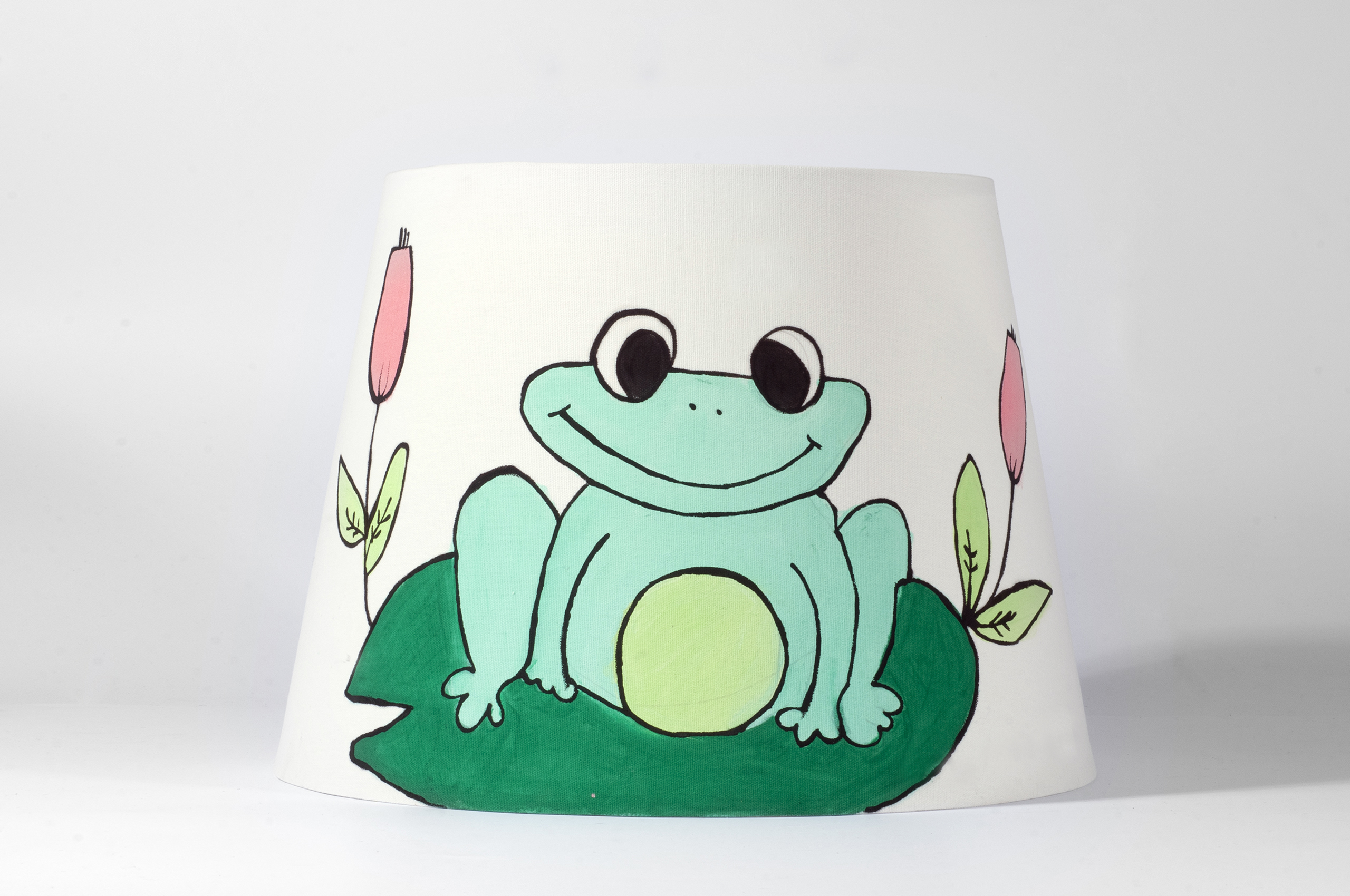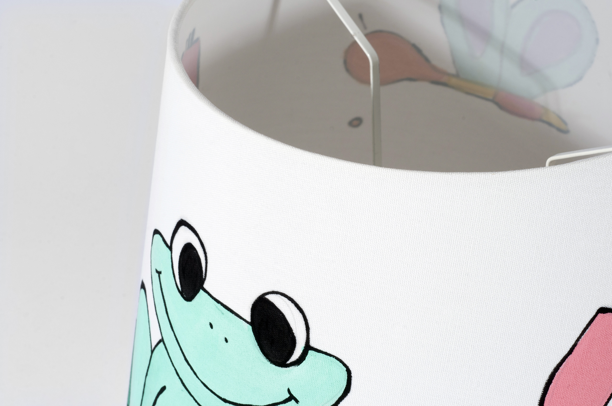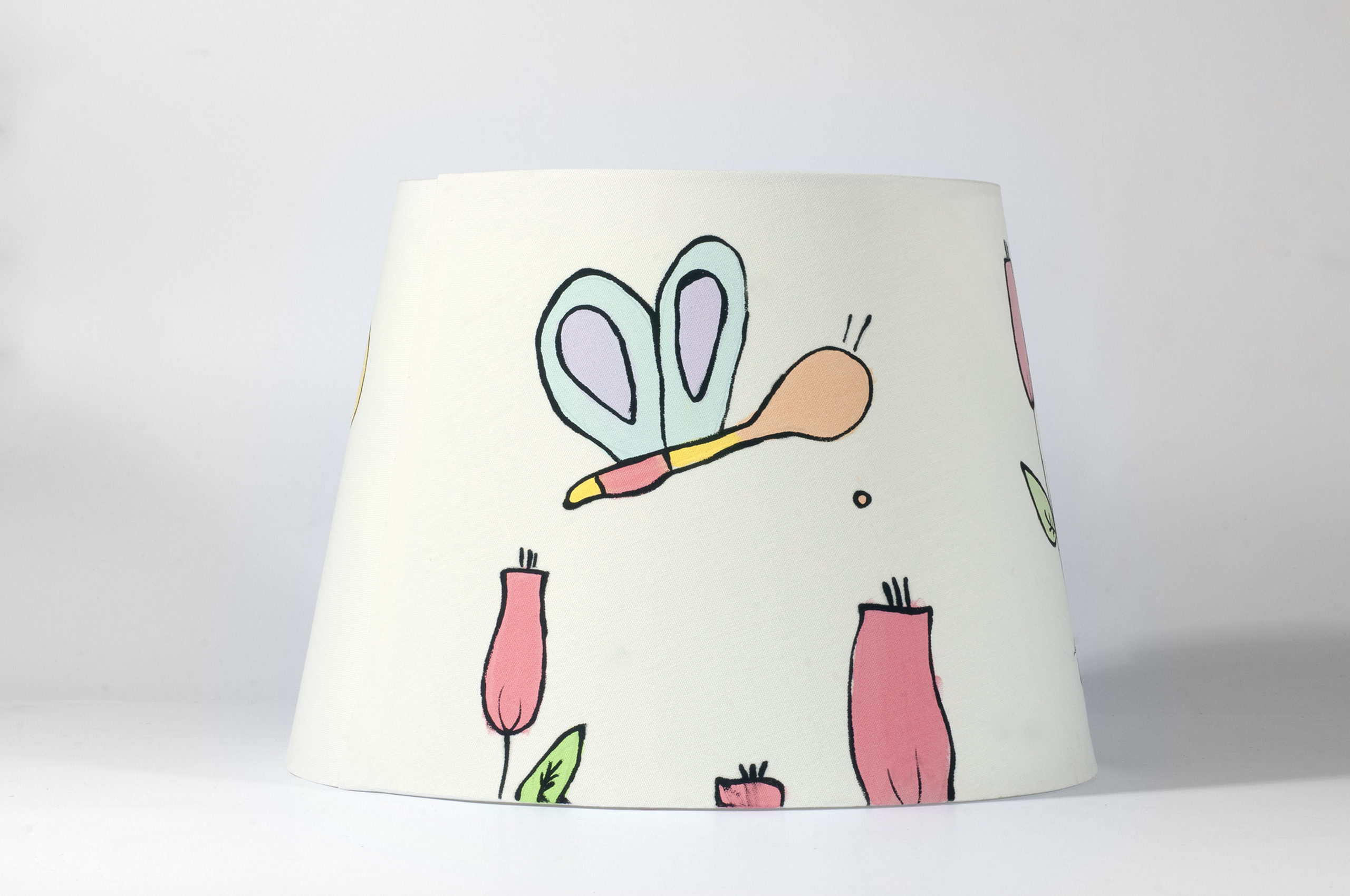 Lampada in tessuto dipinta a mano con temi allegri e colori vivaci. Adatta per camerette di bambini ed ambienti informali, crea atmosfere giocose e divertenti. Il tessuto semitrasparente del paralume, una volta acceso, rende i colori dei disegni brillanti evidenziandone i soggetti.