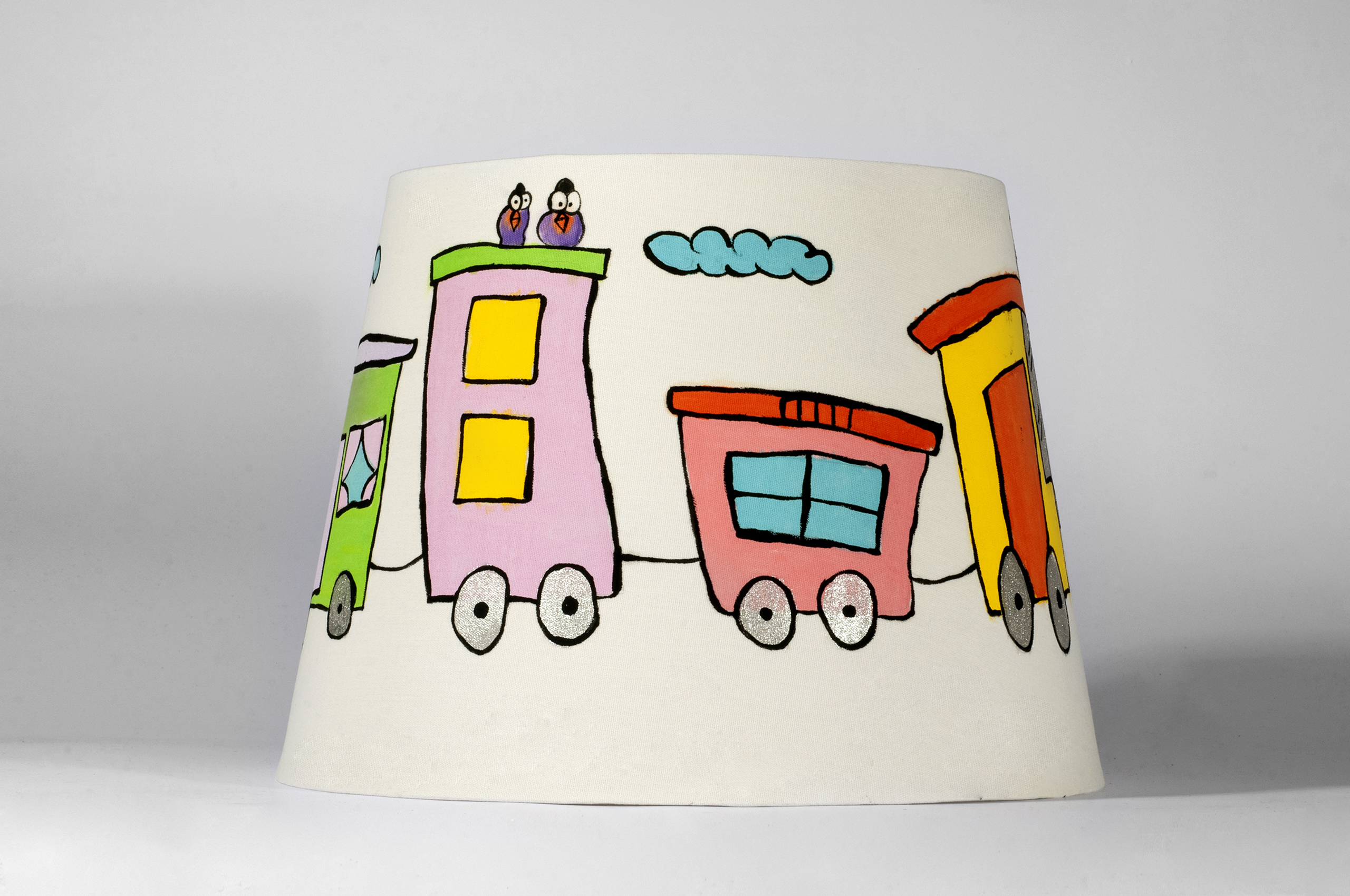 Lampada in tessuto dipinta a mano con temi allegri e colori vivaci. Adatta per camerette di bambini ed ambienti informali, crea atmosfere giocose e divertenti. Il tessuto semitrasparente del paralume, una volta acceso, rende i colori dei disegni brillanti evidenziandone i soggetti.